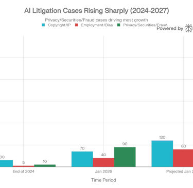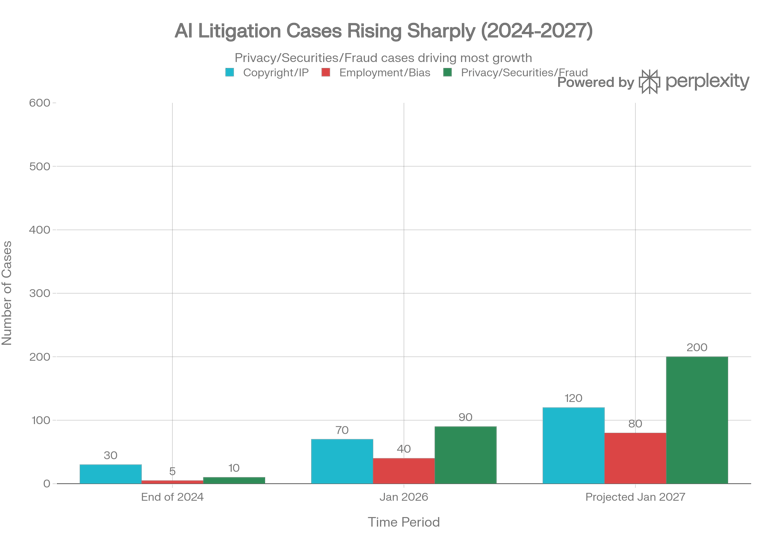 Looking one year ahead, a conservative projection points to 50–100% growth in active AI-salient disputes as regulations mature and plaintiffs’ firms specialize.