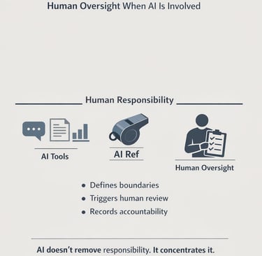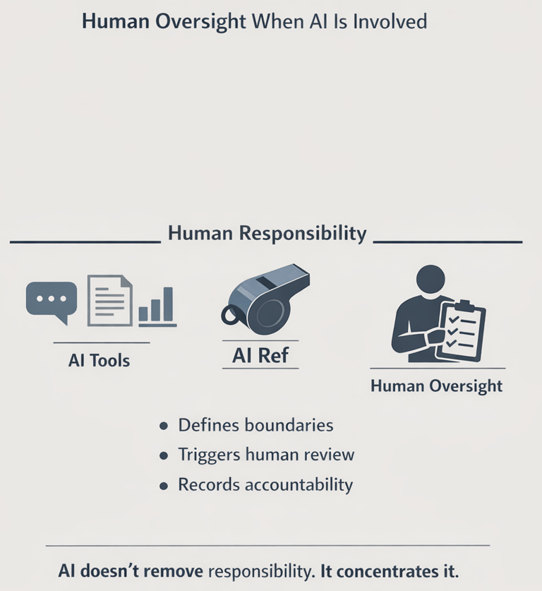It exists to ensure that when AI is used, human responsibility remains explicit.